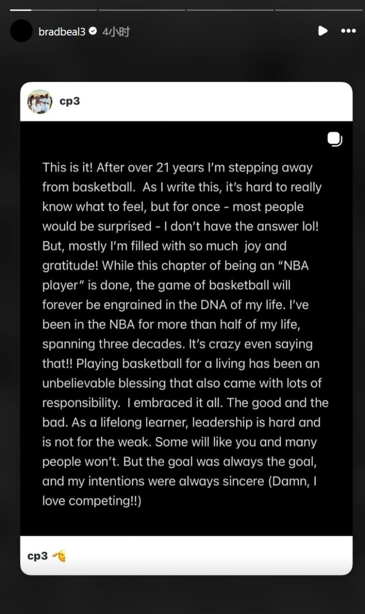 2月14日讯 NBA球星克里斯·保罗在社媒宣布退役,结束21年职业生涯。前队友比尔在INS转发了保罗的退役长文,送上无声祝贺。...
